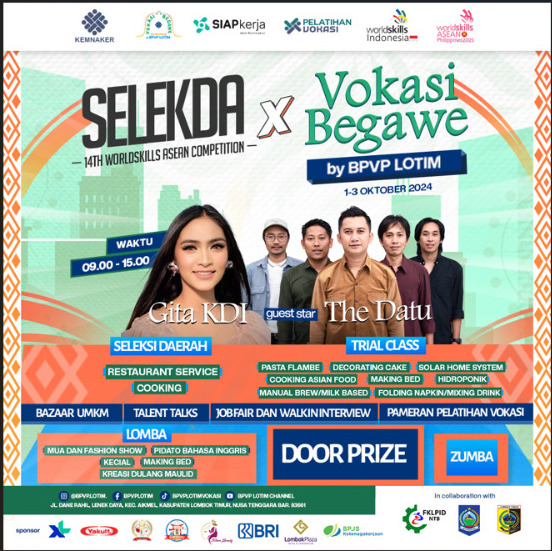 Balai Pelatihan Vokasi dan Produktivitas (BPVP) Lombok Timur (Lotim) pada tanggal 1-3 Oktober 2024 ini akan ada kegiatan Vokasi Begawe. Masyarakat di Pulau Lombok, khususnya di Lotim dipersilakan ikut. Tidak tanggung-tanggung ada pilihan perusahaan yang siap rekrut karyawan dalam ajang Job Fair. Yuk ikutan!