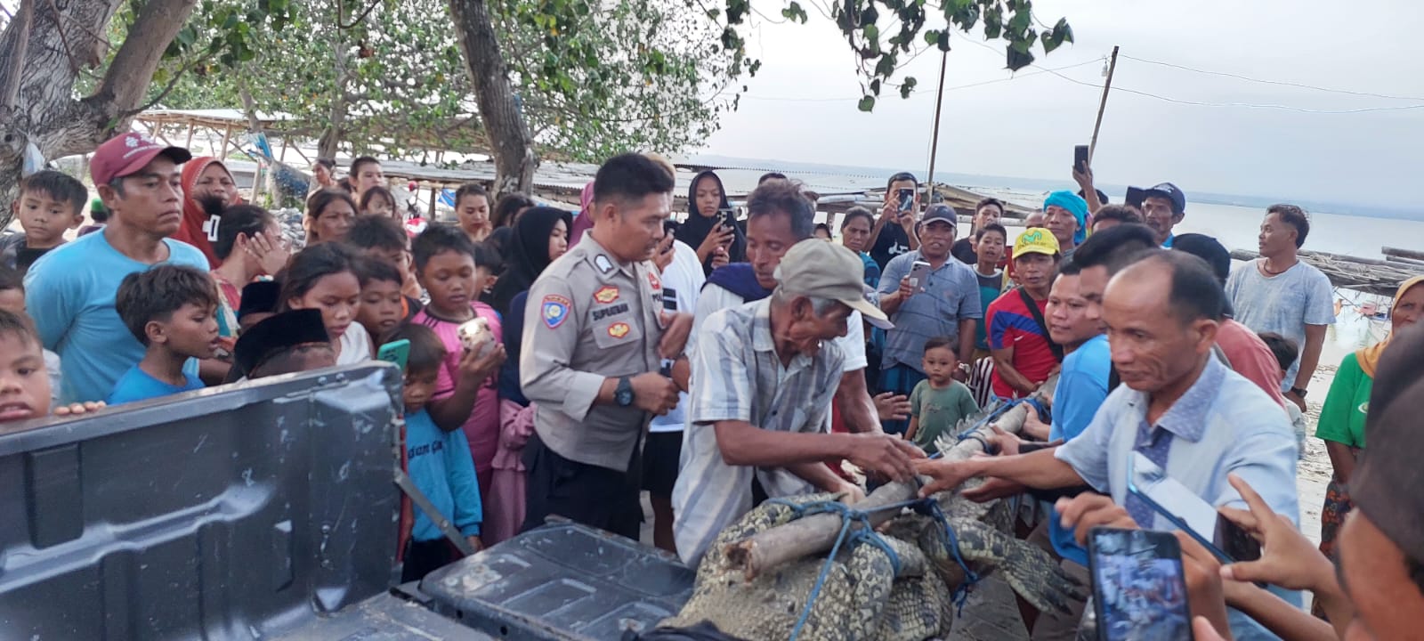“Guna mengantisipasi hal hal yang tidak di inginkan terjadi, kami anggota, bersama saksi, masyarakat, dan pegawai dari PT. Sea Six untuk mengikat seekor buaya tersebut, dan menaikkannya ke mobil Patroli untuk diamankan di Polsek Jerowaru dan menunggu Tim dari Provinsi menjemput.” Ujarnya.