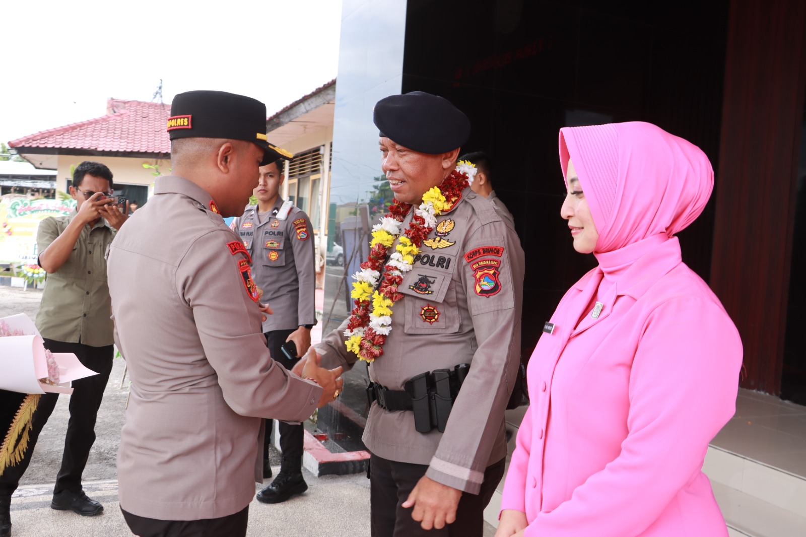 Ada proses penjemputan Pejabat Lama AKBP Hariyanto beserta istri mengambil tempat di depan lobi Mako Polres, didampingi oleh Kapolres Lotim yang baru, AKBP I Komang Sarjana, S.I.K., S.H.