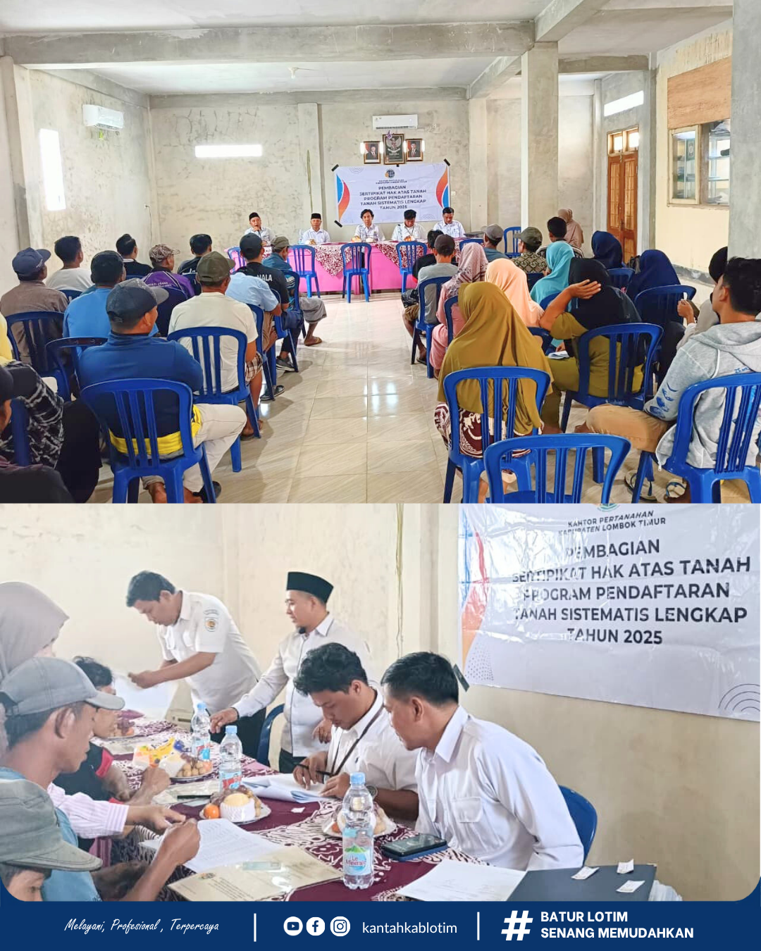 Penegak com – Kabupaten Lombok Timur kembali mencatatkan kemajuan dalam reformasi agraria. Pada Rabu, 29 Oktober 2025, bertempat di Kantor Desa Wanasaba Lauk, Kantor Pertanahan setempat melalui sinergi Satgas Yuridis dan Panitia PTSL Desa, melaksanakan seremoni penyerahan 200 sertipikat tanah.